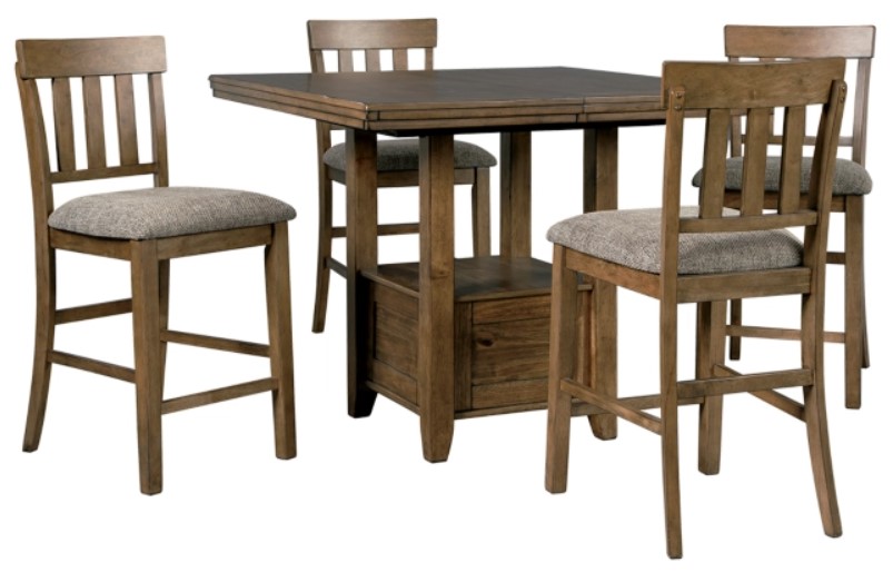 Satisfying your appetite for comfortably stylish living, the Flaybern 5-piece counter height dining set masters the art of refinement—without all the fuss and formality. The crisp and clean extension table, with its simply chic profile, is enhanced with a double-stacked top and a base with a built-in shelf.Read More