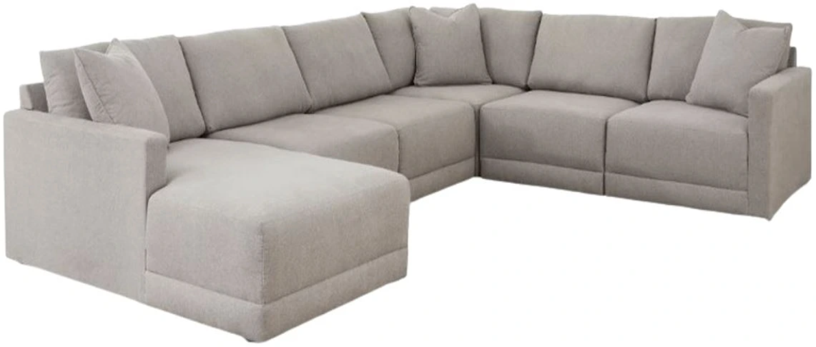 Includes 6 Modular Pieces: Left-arm facing corner chaise, wedge, 3 armless chairs and right-arm facing corner chair