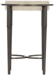 The Bernhardt Living Room Metal Round Cocktail Table. Inset honed White Travertine stone top. Plated steel base and stretchers in Antique Pewter finish. Adjustable glides.Read More