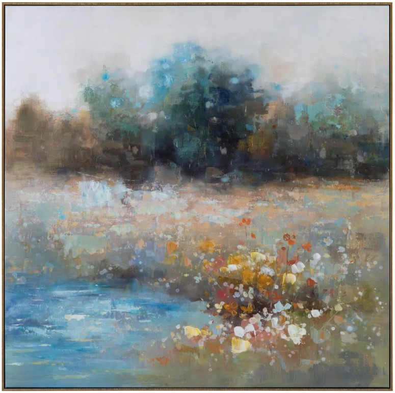 The intricate details of the trees and flowers are brought to life with bold brushstrokes and a masterful use of color, creating a lush and inviting scene that draws the viewer in. Whether you're an art lover or simply looking for a way to brighten up your space, this painting is sure to impress. Measuring at a square shape, this painting is perfect for hanging on any wall in your home or office. And to add an extra touch of luxury, it comes finished with a beautiful gold frame that complements the colors of the painting perfectly.