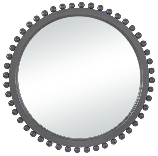 Contemporary wall mirror accentuates a round frame with thick frame and carved ball lining the outer frame