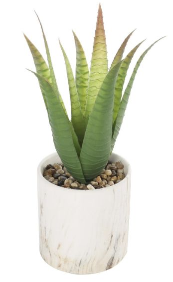 Indoor fake potted plant comes in a traditional aloe plant shape with a faux marble cylindrical pot and small pebbles