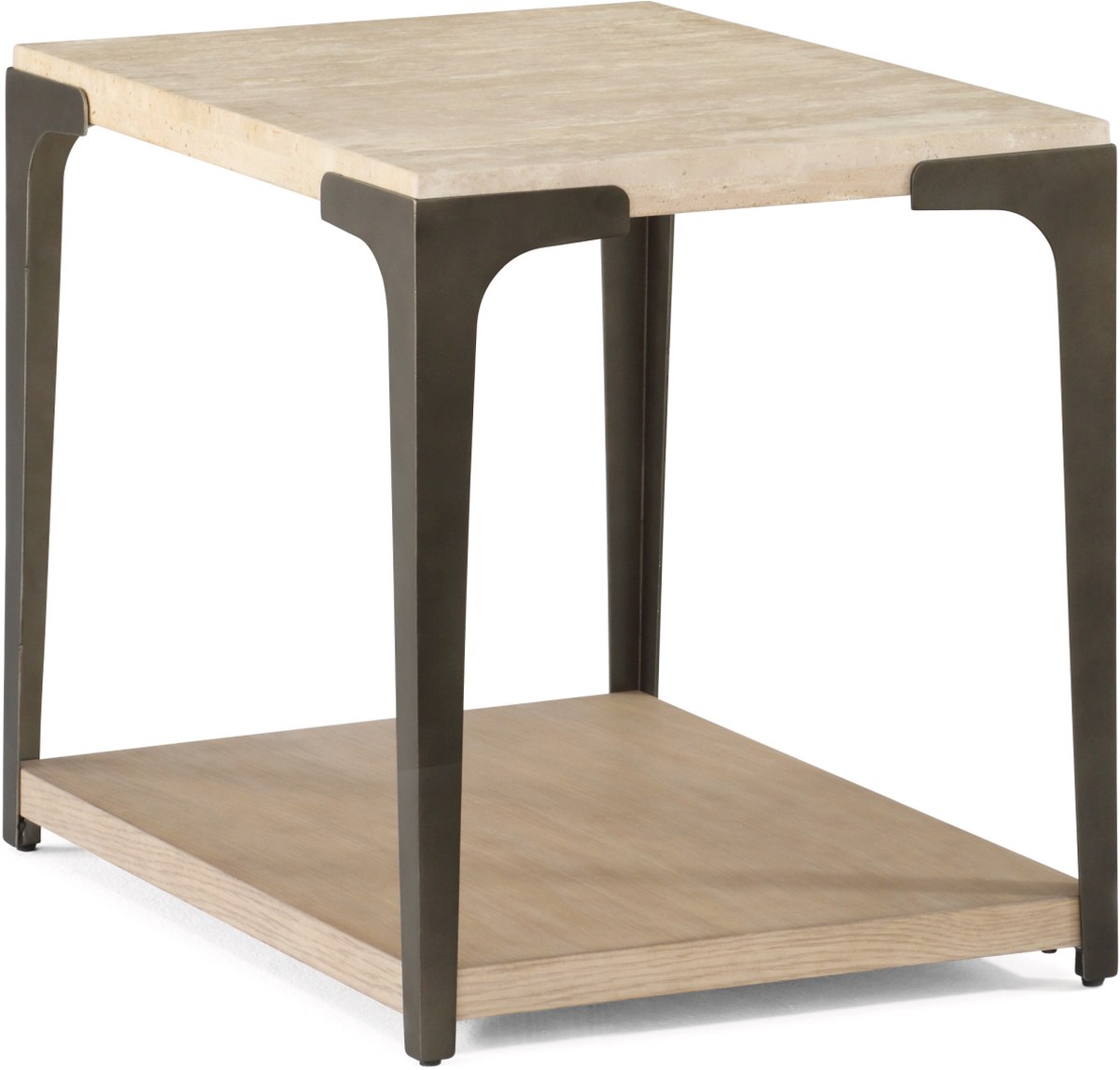 A bold union of natural elements. Timeless materials make a statement of style in modern to traditional spaces. The Omni End Table features a stunning travertine stone surface, polished to reveal its natural pores. A lower oak shelf is perfect for additional storage or display. Dark metal legs offer an eye-catching contrast.Read More