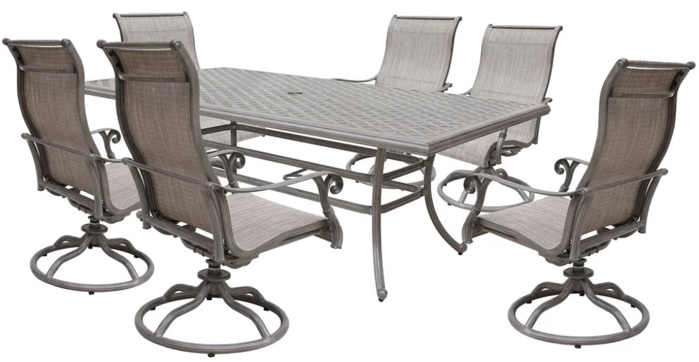 Elevate outdoor dining with this Macan dining set. Crafted from durable cast aluminum with full circumference polished welds, it features a weather- and rust-resistant powder-coated finish, hand-applied detailing, and six comfortable sling swivel chairs with protective nylon end caps.Read More