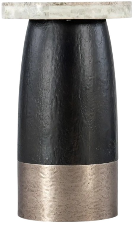 Finish: Black base with a unique hand-hammered forged pewter metal accent with honed silver travertine stone veneer top