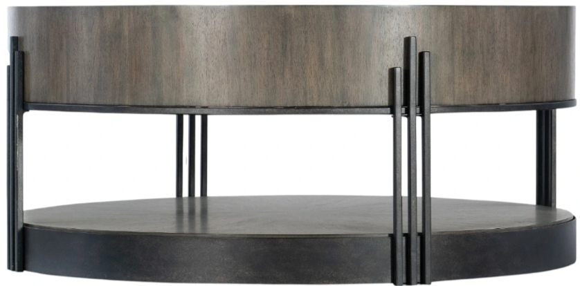 Chic industrial gets an art deco influence in the 40-inch round Skyline cocktail table. The eclectic piece combines acacia wood with sheet metal and metal tube, accented by a stunning starburst veneer pattern on the top surface. The table is finished in dark natural wood with dark bronze metal banding and legs.Read More