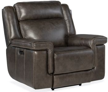 Chunky and comfy in the chic Cosmos Cocao finished top-grain leather, the Montel Power Recliner has it all: smooth reclining motion to the lay-flat position, a power headrest, adjustable lumbar support and a USB port. Tailoring details include a bustle-style back and decorative top stitching.Read More