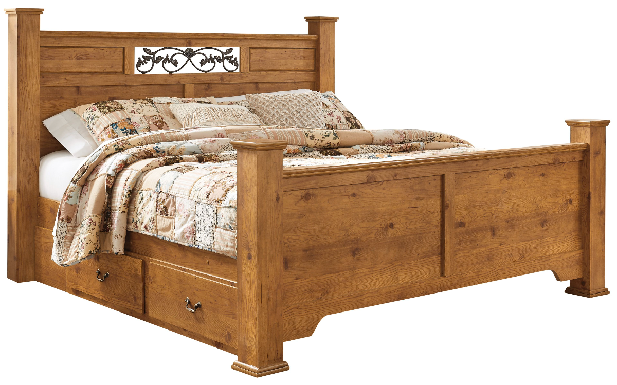 A fresh take on Early American country furniture. When it comes to style, this queen poster bed set lets nature take its course with details including a brilliant replicated pine grain finish and a clever combination of raised and flat panels on the headboard and footboard. The headboard's scroll insert, made to look like wandering vine, is a naturally beautiful tie-in. Underbed storage includes two smooth operating drawers, handy for keeping bedtime essentials. Mattress and foundation/box spring sold separately.
