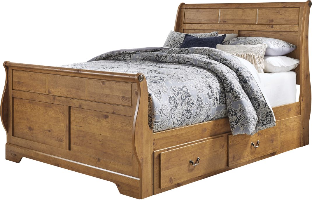 A fresh take on early American country furniture. When it comes to style, this queen sleigh bed with storage lets nature take its course with details including a brilliant replicated pine grain finish and a clever combination of raised and recessed panels. Sinuous sleigh styling on the headboard and footboard enhances a classic aesthetic sure to be admired for years to come. Mattress and foundation/box spring available, sold separately.