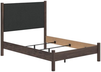 Includes upholstered panel headboard and panel footboard with rails