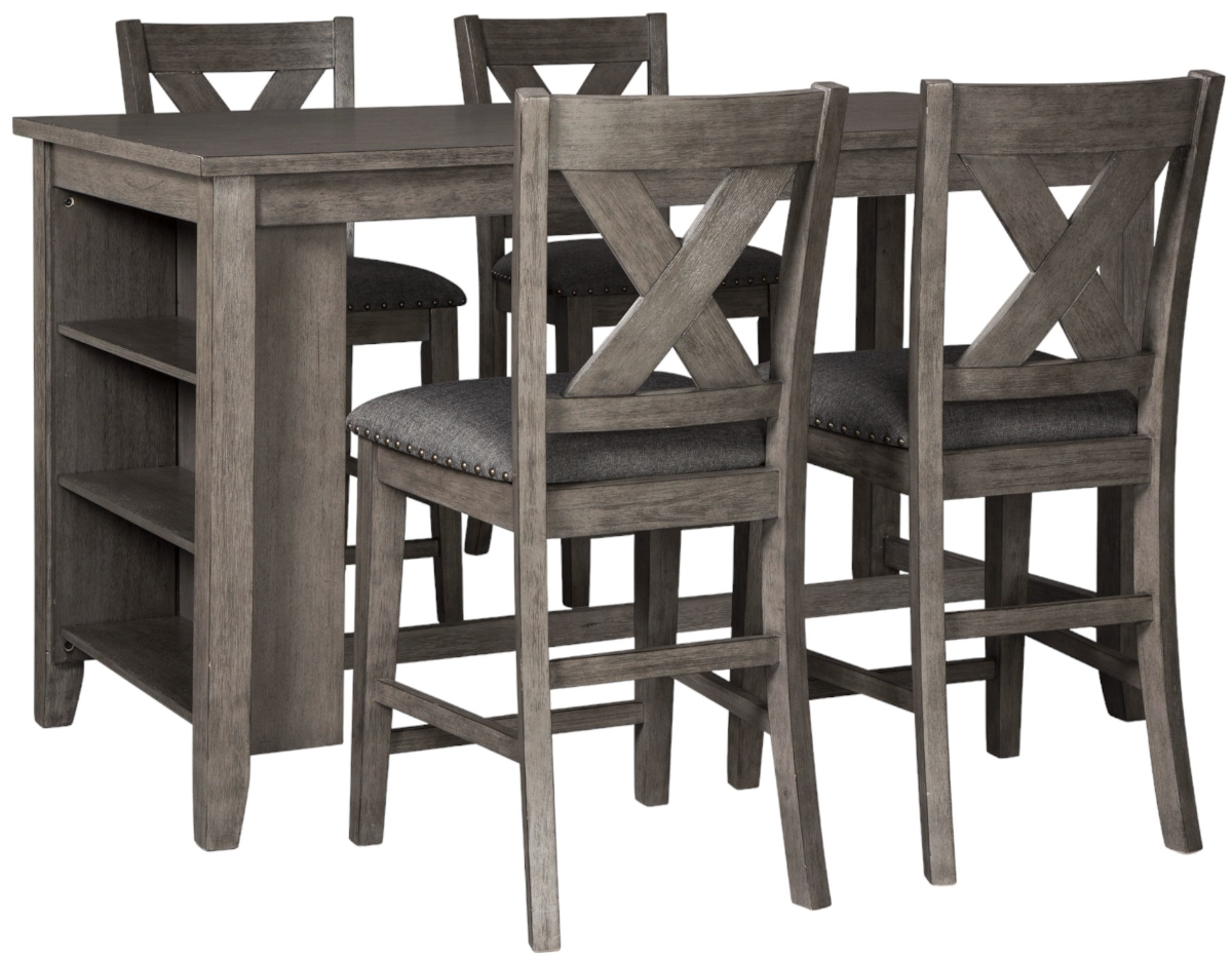 Bring a relaxed yet refined sense of good taste to your space with this 5-piece counter-height dining set. The antiqued gray wash finish gives the clean-lined design a casually cool sensibility. The table’s side shelves cleverly balance form and function while the classic x-back design and textured gray upholstery of the stools serves up high style. This set is an inspired choice for modern farmhouse living.Read More