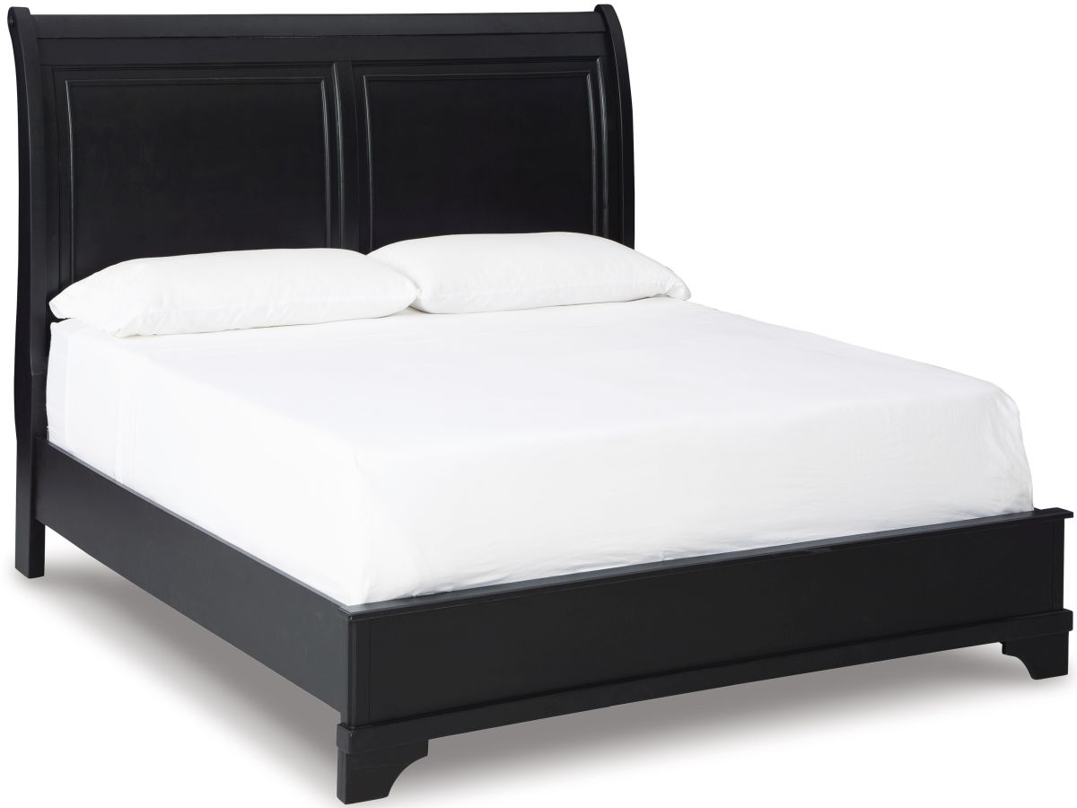 This king sleigh bed has a timeless look and traditional design that dresses up your bedroom. Its black finish adds a casual aesthetic. while the sleigh headboard with double-framed panels is offset by a low-profile footboard.Read More