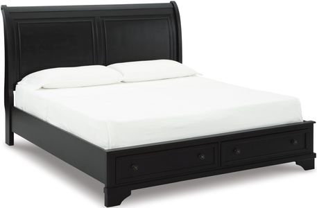 Includes king sleigh headboard, rails and storage footboard with roll slats
