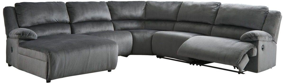Includes 5 pieces: left-arm facing reclining chaise, right-arm facing recliner, 2 armless chairs, and wedge