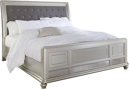 This Queen upholstered sleigh bed allures with the glitz and glam befitting silver screen queens. Exquisite frame's metallic tone channels that Hollywood Regency flair you've been dreaming of. Fabric inlay with crystal-look button tufting will have you feeling sheltered in comfort and luxury. Assembly required for this product.Read More