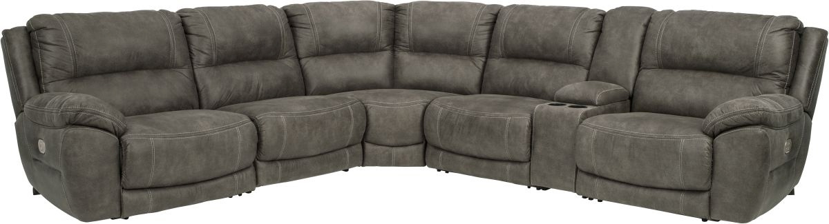 Includes 6 pieces: left-arm facing zero wall power recliner, console with storage, 2 armless power recliners, right-arm facing zero wall power recliner, and wedge