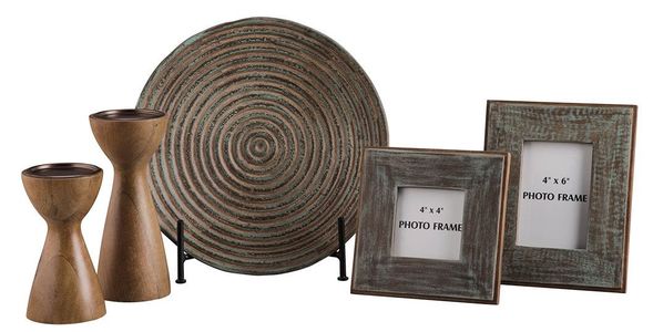 Bring a touch of the outdoors inside your home with this five-piece accessory set. Green patina-style finish on the charger and picture frames is the perfect match for the natural wood finish of the candle holders.