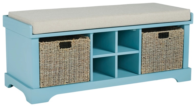 This Dowdy storage bench uses solid veneer and engineered wood frame construction that comes in a teal finish. This bench features 2 rattan baskets, 4 shelves, and a reversible cushion upholstered in beige polyester fabric.Read More