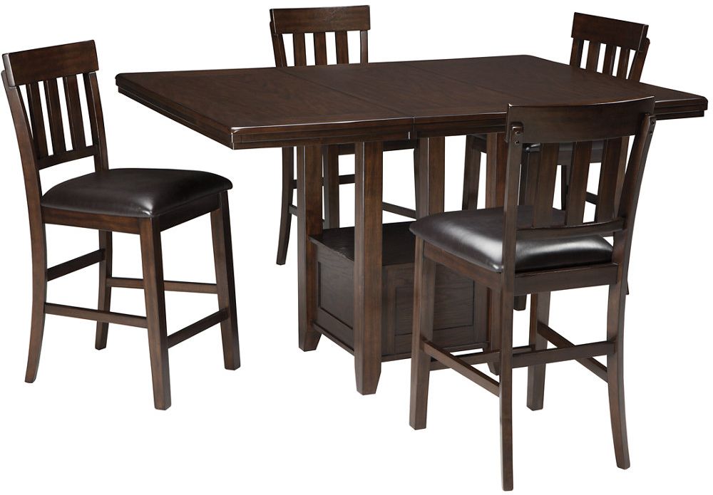 Modern sophistication, beautifully served. This counter height dining table set with drop-in extension leaf raises the bar with a simply striking design and rich, dark finish. Four slat-back bar stools adorned with faux leather upholstered seats offer comfort and easy-care appeal.Read More
