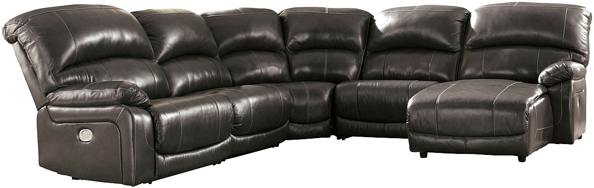 Fashion-forward style. Sumptuous leather feel and appeal. Total comfort at your fingertips. It’s all yours for the taking with the Hallstrung power reclining sectional. Wrapped in a rich charcoal gray upholstery, this decidedly contemporary power sectional tantalizes the senses in so many ways. Rest assured, the seating area is covered in 100% leather for your pleasure, while a skillfully matched faux leather on the exterior makes luxury affordable.