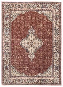 The medium Haydrien rug features a brick-red motif laced with shapes of beige and blue that make a bold interior design statement.