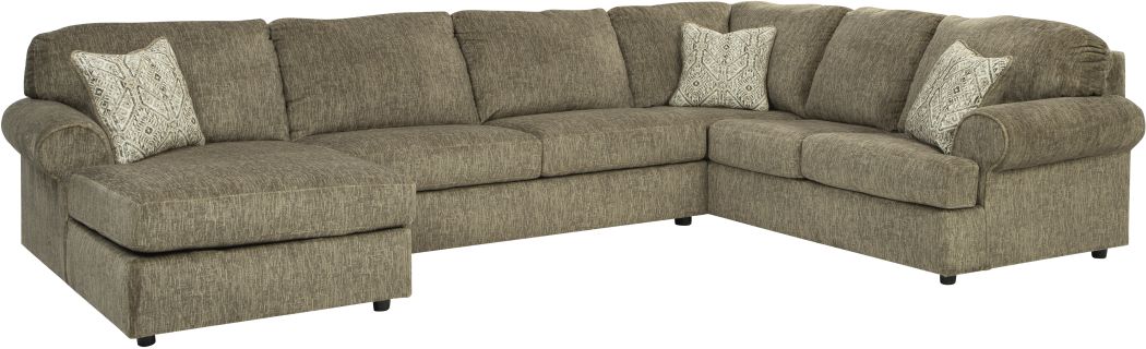 Includes 3 pieces: left-arm facing corner chaise, armless loveseat and right-arm facing sofa