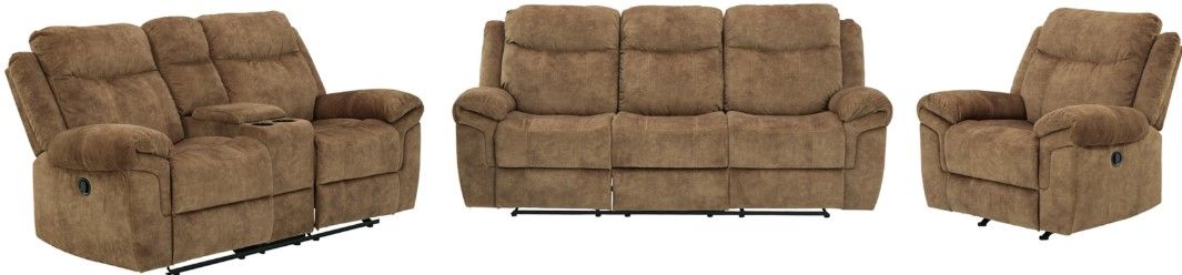 Includes reclining sofa, reclining loveseat with console and rocker recliner