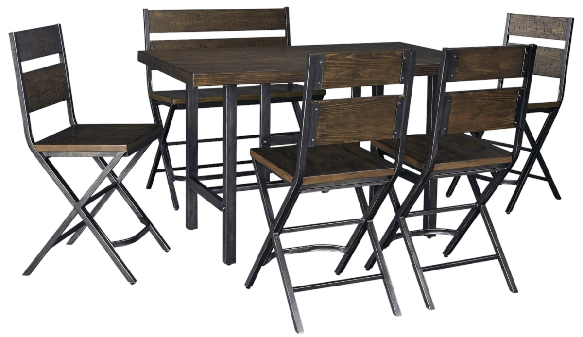 Includes 6 pieces: rectangular counter height dining table, 1 double bar stool and 4 single bar stools