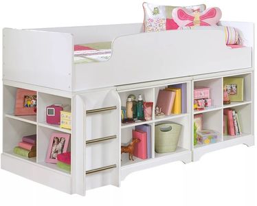 This bed’s clean lines and versatile white finish complement virtually every style of décor. Whether her new favorite color is pink, purple or blue, her bedroom furniture will be a mainstay. Six built-in drawers and a multi-compartment bookcase create much-needed storage. Mattress available, sold separately.