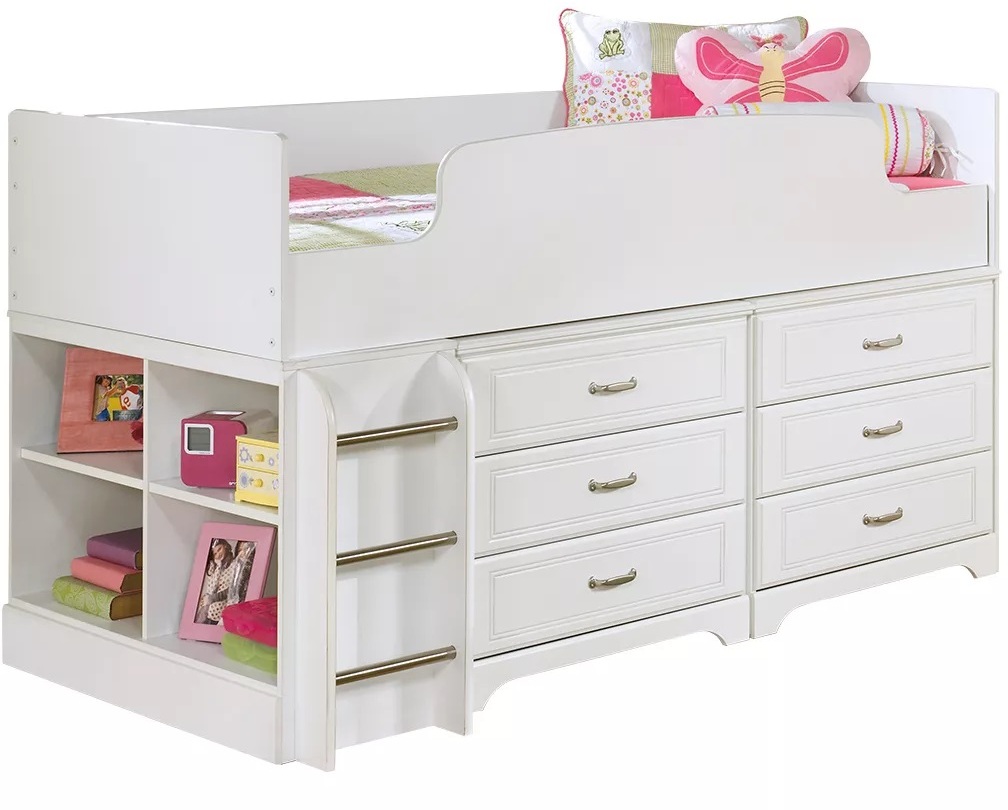 This bed’s clean lines and versatile white finish complement virtually every style of décor. Whether her new favorite color is pink, purple or blue, her bedroom furniture will be a mainstay. Six built-in drawers and a multi-compartment bookcase create much-needed storage. Mattress available, sold separately.