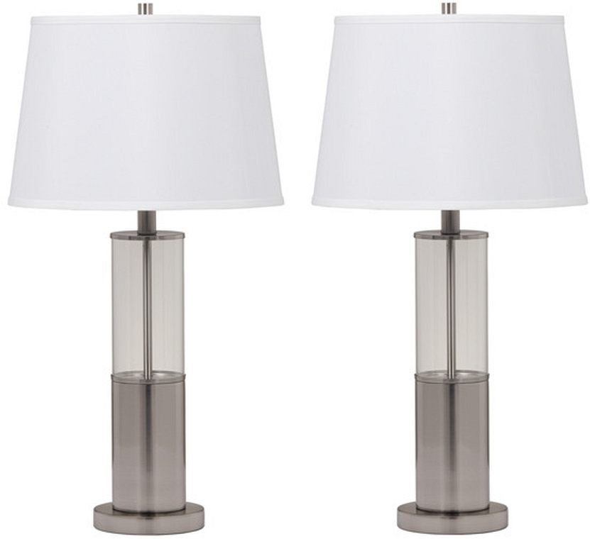 The Normal silver table lamps are sold in sets of 2 and feature a cylindrical base that’s half-metal with a brushed finish and half glass for a striking look. Lamps use a fabric shade for soft, diffused light (lightbulb not included).