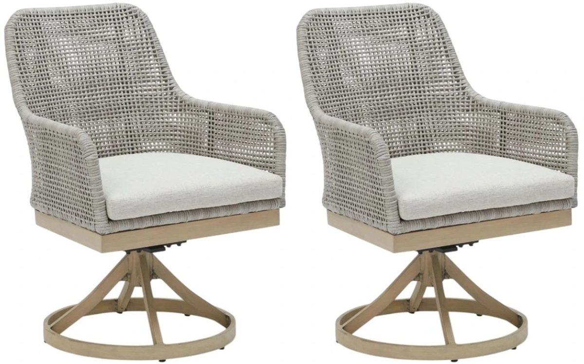 This set of 2 swivel dining chairs invites your casual contemporary style outdoors. With its resin wicker in a chic neutral hue, it expertly marries refined design with durability. Its 360-degree swivel makes it easy to switch from watching the kids at the pool to grabbing a drink from the table.Read More