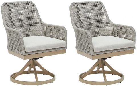 This set of 2 swivel dining chairs invites your casual contemporary style outdoors. With its resin wicker in a chic neutral hue, it expertly marries refined design with durability. Its 360-degree swivel makes it easy to switch from watching the kids at the pool to grabbing a drink from the table.Read More
