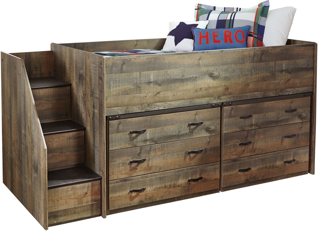 Whether she loves horses or he's a cowboy at heart, Trinell loft bed with storage matches their authenticity. Rustic finish, plank-style details and nailhead trim pay homage to reclaimed barn wood, making for a chic look loaded with charm. Mattresses available, sold separately.