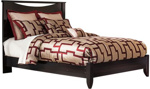 The Zanbury queen panel bed is making waves in contemporary style. Swoop-shaped cutout is a cut above, adding great visual interest. Merlot finish over replicated mahogany grain is rich and alluring. Mattress and foundation/box spring sold separately. Assembly required for this product.Read More