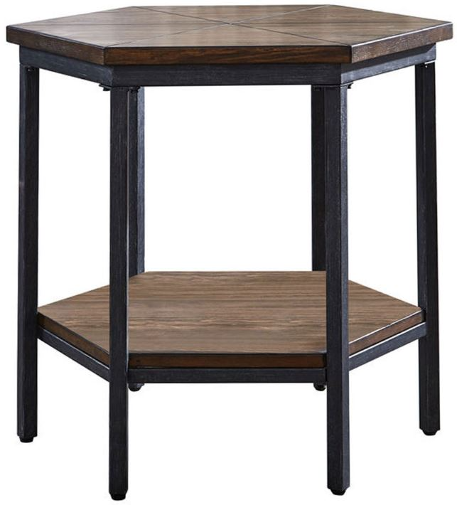 Mixed media occasional collection that features a castered lift-top cocktail table for easy mobility. The contemporary collection features an interesting hexagonal shape on the cocktail and end table, accented by a hexagonal veneer layup top. The mocha finish and iron base add style to the functionality of the collection.Read More