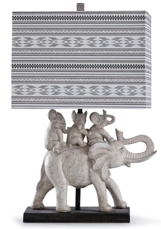 Worldly gray elephants table lamp with on rectangle base and designer linen patt